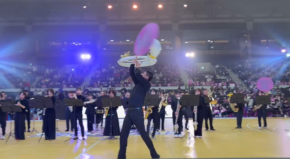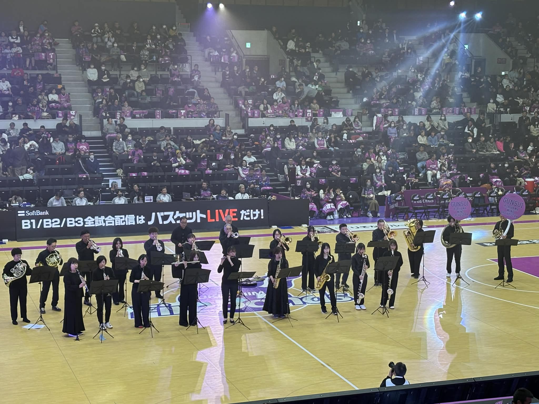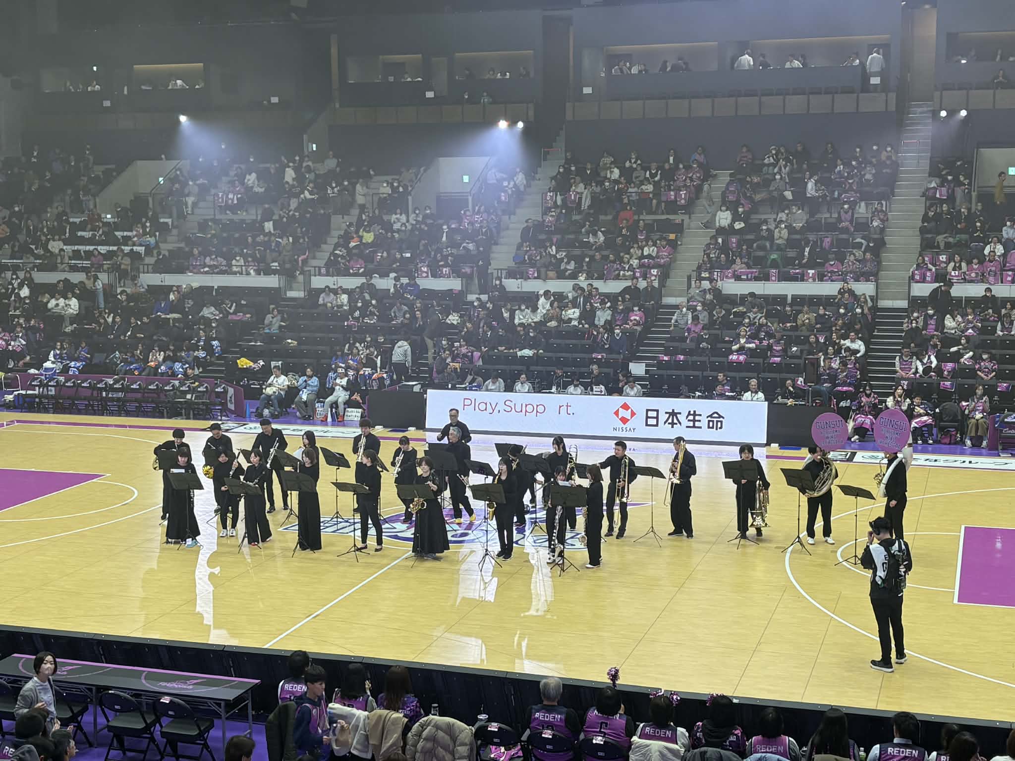 四方からの4000人を超えるブースターに圧倒されながらも、コートの真ん中に立ち、郡山吹奏楽団も熱い演奏で応炎しました。